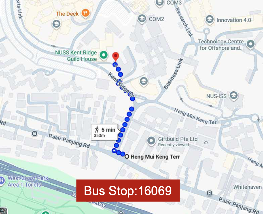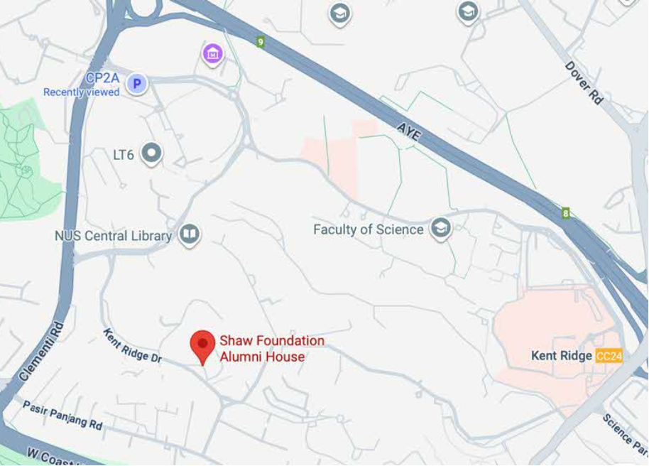 Kent Ridge MRT (CC24), Exit A, then walk 24 min to SHAW FOUNDATION ALUMNI HOUSE